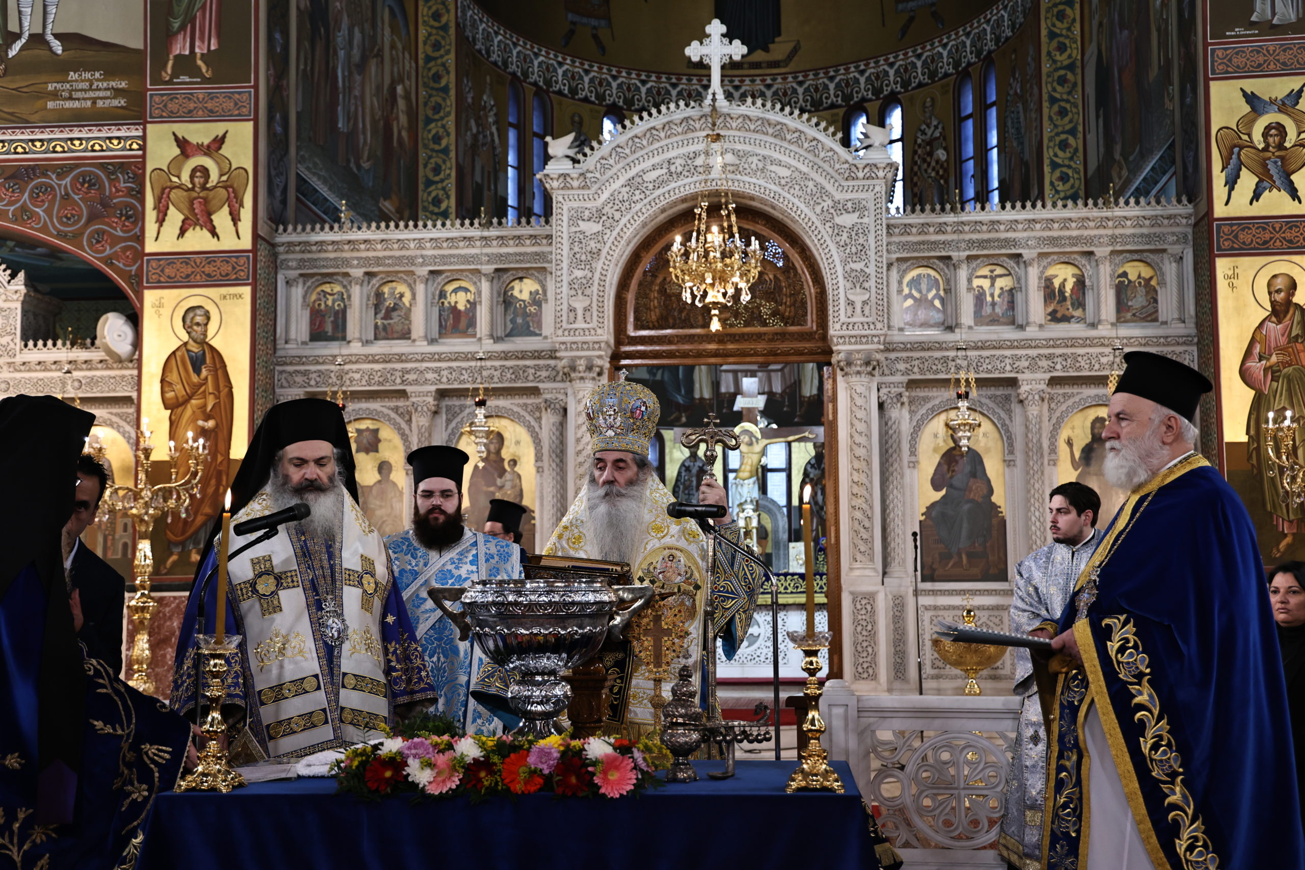 Νωρίτερα, στον Καθεδρικό Ναό Αγίας Τριάδας Πειραιώς τελέστηκε Αρχιερατικό συλλείτουργο, προεξάρχοντος του Μητροπολίτη Πειραιώς κ. Σεραφείμ και συλλειτουργούντος του Θεοφιλεστάτου Επισκόπου Αχελώου κ. Νήφωνος. Συμπροσευχόμενος εκ του ιερού βήματος παρέστη ο Μακαριώτατος κ.κ. Ιερώνυμος.