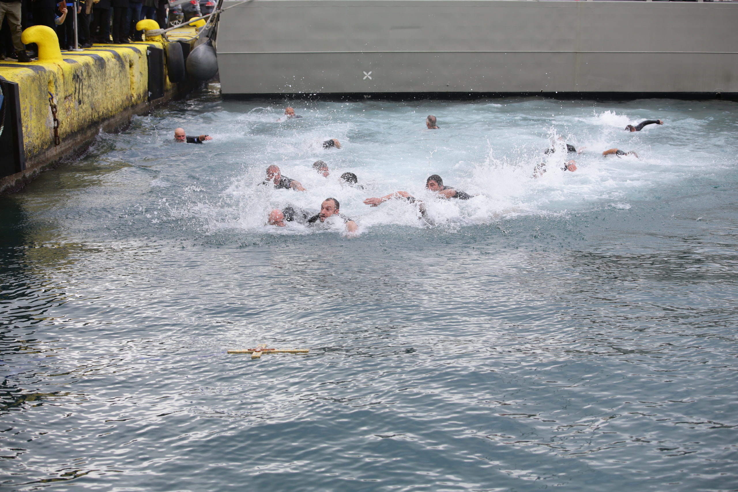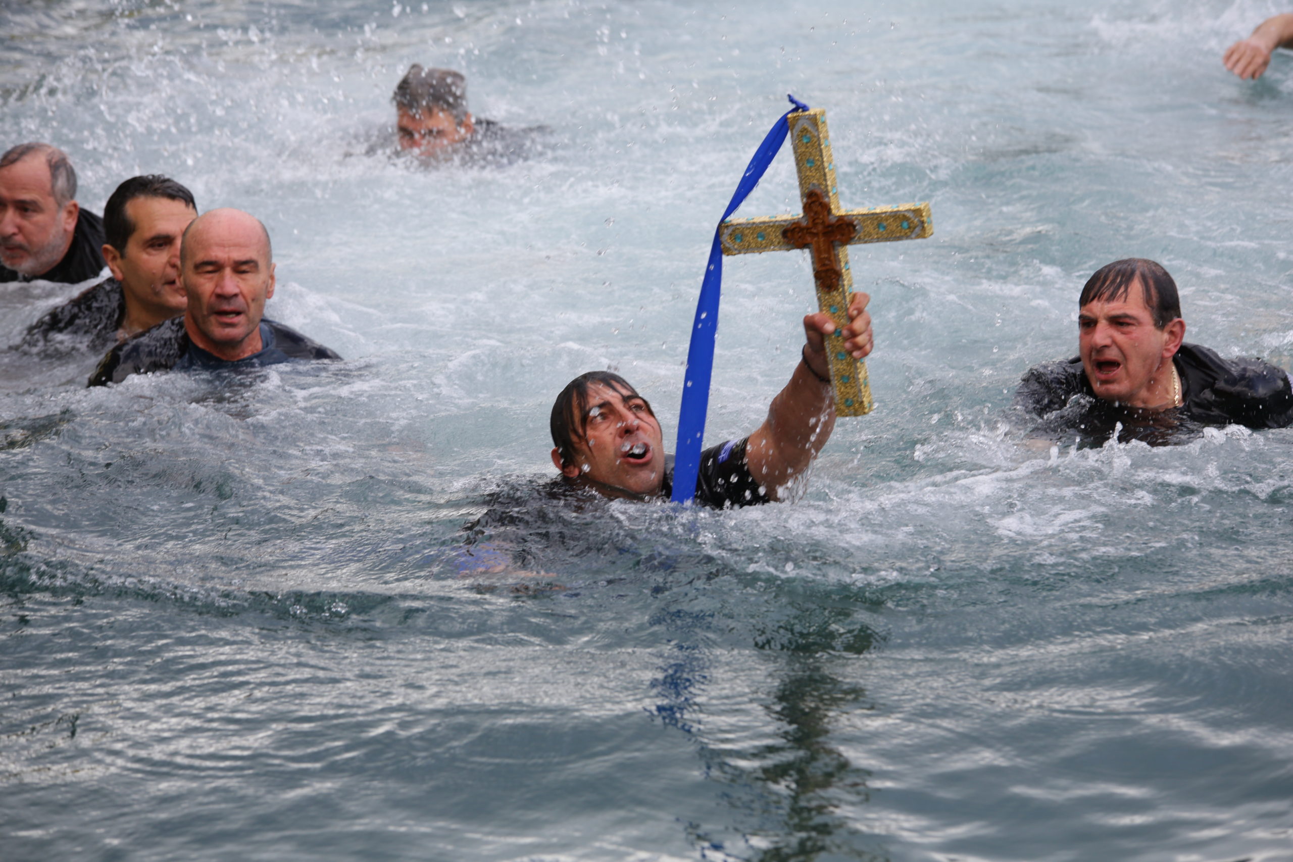 Στη συνέχεια εν πομπή από τον Καθεδρικό Ναό κλήρος, άρχοντες και λαός κατευθύνθηκαν στην ειδικά διαμορφωμένη προβλήματα από την οποία πραγματοποιήθηκε η τελετή της κατάδυσης του Τιμίου Σταυρού το οποίον βούτηξαν στα κρύα νερά για να ανασύρουν άνδρες της επίλεκτης Ομάδας Υποβρυχίων Καταστροφών.