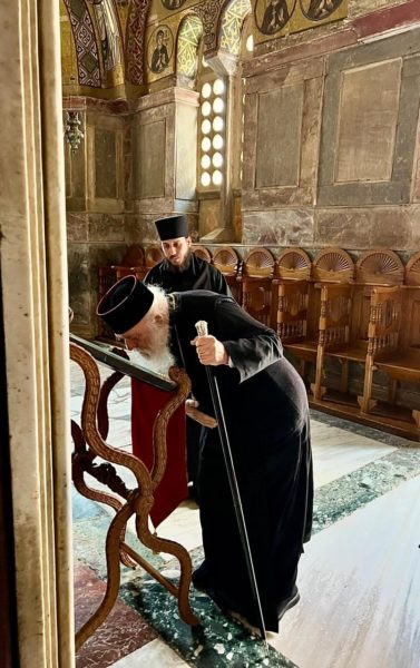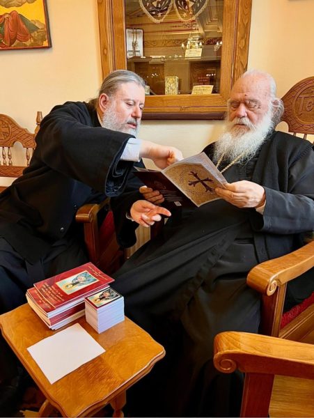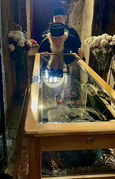 Ο Μακαριώτατος, αφού προσκύνησε το χαριτόβρυτο λείψανο του Οσίου, εν συνεχεία, ενημερώθηκε από τον Καθηγούμενο της Ιεράς Μονής π. Σεραφείμ και την μοναστική αδελφότητα, για την πρόοδο των επισκευαστικών εργασιών που επιτελούνται στον χώρο.