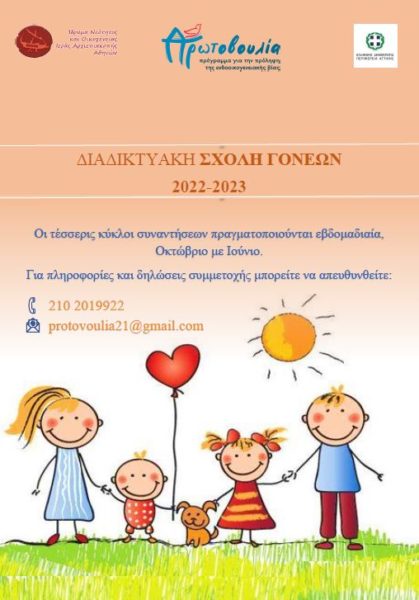 Την Πέμπτη 19 Ιανουαρίου 2023 ξεκινά ο δεύτερος κύκλος της Διαδικτυακής Σχολής Γονέων του Προγράμματος «Πρωτοβουλία για την πρόληψη της ενδοοικογενειακής βίας» για γονείς και κηδεμόνες παιδιών ηλικίας 7-12 ετών. Θα πραγματοποιηθούν τέσσερις (4) διαδικτυακές συναντήσεις μέσω ΖΟΟΜ και μία δια ζώσης στο τέλος του κύκλου.