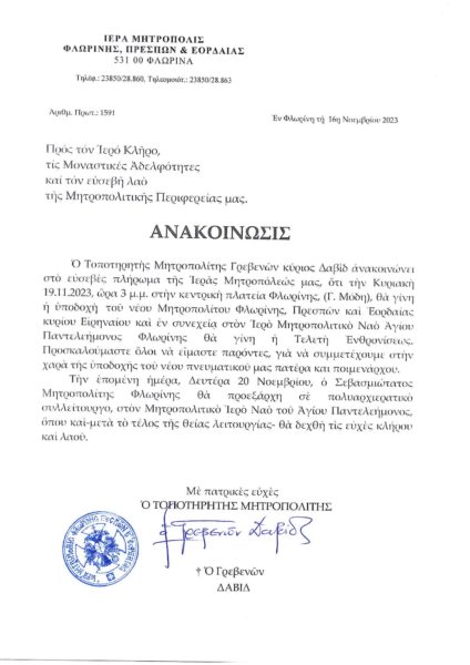 Αναλυτικά η Εγκύκλιος του Τοποτηρητή της Ιεράς Μητροπόλεως, Μητροπολίτη Γρεβενών κ. Δαβίδ: