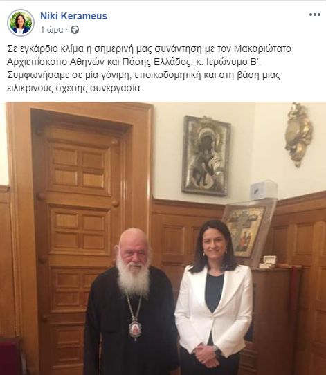Το καλό κλίμα της συνάντησης της Τρίτης στο Μέγαρο Μαξίμου μεταξύ του Πρωθυπουργού και του Αρχιεπισκόπου Αθηνών κ.κ. Ιερωνύμου, ήρθε να επιβεβαιώσει η χθεσινή επίσκεψη της Υπουργού Παιδείας κ. Νίκης Κεραμέως στο Μέγαρο της Αρχιεπισκοπής Αθηνών.