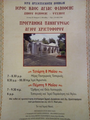 Το ιερό λείψανο του αγίου Χριστοφόρου που φυλάσσεται στον ιερό ναό Αγίας Φιλοθέης Δήμου Φιλοθέης – Ψυχικού τίθεται προς προσκύνηση με αφορμή την εορτή του αγίου στις 9 Μαΐου. Την Τετάρτη 8 Μαΐου στις 19:00 το απόγευμα θα τελεσθεί Μέγας πανηγυρικός εσπερινός και στην συνέχεια ιερά αγρυπνία, ενώ την επόμενη ημέρα, Πέμπτη 9 του μηνός, ημέρα μνήμης του Αγίου, στις 7:00 το πρωί θα τελεσθεί Όρθρος και Θεία Λειτουργία και στις 18:00 μ.μ. Εσπερινός και Ιερά Παράκληση του Αγίου.