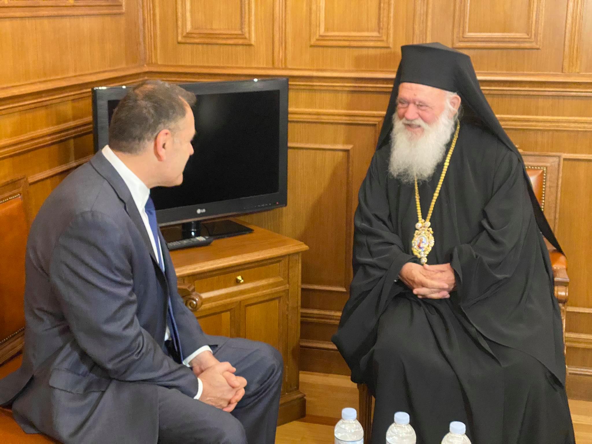 Ο Αρχιεπίσκοπος Αθηνών εξέφρασε τη χαρά και τη συγκίνησή του για τη επίσκεψη του υπουργού, και τόνισε ότι ο σύνδεσμος της Εκκλησίας με τις ένοπλες δυνάμεις είναι πολύ παλιός, εκφράζοντας την ελπίδα ότι θα συνεχιστεί: “Πρόκειται για ένα συμβολικό δώρο, μια μικρή συμβολή στους κόπους και τις θυσίες σας, που συμβολίζει ότι είμαστε κοντά σας, ότι είμαστε μαζί σας” υπογράμμισε ο Αρχιεπίσκοπος, αναφερόμενος παράλληλα στην μεγάλη προσφορά της Εκκλησίας στην Επανάσταση του 1821, όταν ρευστοποίησε χρυσό και ασήμι και διέθεσε τα χρήματα για τον εθνικό αγώνα.