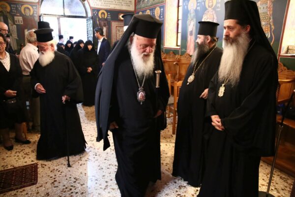 Ο Μακαριώτατος κ.κ. Ιερώνυμος συνοδευόμενος από τον Πρωτοσύγκελο της Ιεράς Αρχιεπισκοπής Αθηνών προσήλθε στην Ιερά Μονή για την τέλεση της ενθρονίσεως της Ηγουμένης της Ιεράς Μονής Πελαγίας.