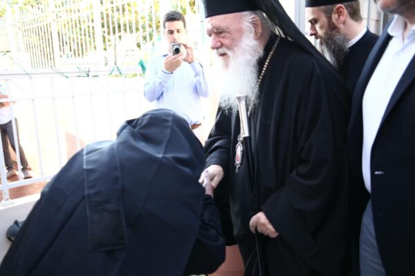 Ο Μακαριώτατος κ.κ. Ιερώνυμος συνοδευόμενος από τον Πρωτοσύγκελο της Ιεράς Αρχιεπισκοπής Αθηνών προσήλθε στην Ιερά Μονή για την τέλεση της ενθρονίσεως της Ηγουμένης της Ιεράς Μονής Πελαγίας.