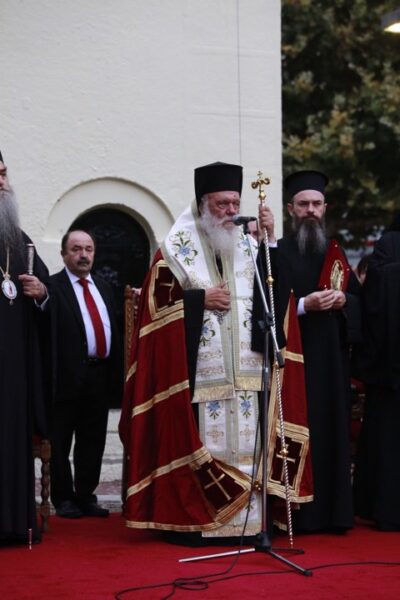 Κατόπιν, ο Αρχιεπίσκοπος εξέφρασε τη συγκίνησή του τονίζοντας πως αποδίδουμε τιμή στους προγόνους μας που θυσιάστηκαν για την απελευθέρωση αυτού του τόπου και για όσους εργάστηκαν για την εδραίωση της ελευθερίας στο νέο ελληνικό κράτος. Υπογράμμισε, ακόμη, ότι η παρουσία και ο λόγος της Εκκλησίας μέσα στο σύγχρονο κόσμο δε μπορεί παρά να έχει τρεις στοχεύσεις. Πρώτον να εργαστούμε με όλη μας τη δύναμη για την ενότητα του λαού και αυτό το προσκλητήριο δεν εξαιρεί κανέναν. Δεύτερον να καταβάλλουμε κάθε δυνατή προσπάθεια για την ειρηνική συνύπαρξη όλων των ανθρώπων ανεξαιρέτως και τρίτον να καταδικάσουμε τον εθνοφυλετισμό στον οποίο οφείλονται πολλά βάσανα του λαού μας.