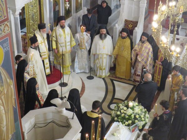 Λίγο νωρίτερα, τελέστηκε Αρχιερατική Θεία Λειτουργία, προεξάρχοντος του Επισκόπου Ωρεών κ. Φιλοθέου, Αρχιγραμματέα της Ιεράς Συνόδου της Εκκλησίας της Ελλάδος.