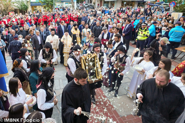 Αὐτή τήν ἱστορική καί σεπτή καί θαυματουργό εἰκόνα μεταφέραμε σήμερα στήν ἐνορία σας, μέ τήν ἄδεια τοῦ Μακαριωτάτου Ἀρχιεπισκόπου Ἀθηνῶν καί πάσης Ἑλλάδος κ. Ἱερωνύμου, τόν ὁποῖο καί εὐχαριστοῦμε ἀπό καρδίας θερμότατα, γιά νά λάβετε καί σεῖς τήν εὐλογία καί τή χάρη της, τήν ὁποία ἔχουμε ὅλοι ἀνάγκη στή δύσκολη αὐτή ἐποχή πού ζοῦμε καί μέ τούς κινδύνους πού ἀντιμετωπίζουμε ὡς ἄτομα ἀλλά καί ὡς ἀνθρωπότης. Κινδύνους καί πειρασμούς γιά τούς ὁποίους θά πρέπει νά ἱκετεύουμε τή στοργική Μητέρα τοῦ Κυρίου μας καί Ὑπέρμαχο Στρατηγό τοῦ Γένους μας νά ἀπομακρύνει, ὥστε μέ τή βοήθειά της καί τίς πρεσβεῖες καί τή χάρη τοῦ ἁγίου ἐνδόξου μεγαλομάρτυρος Δημητρίου τοῦ μυροβλύτου νά ἀπαλλαγοῦμε ἀπό παντός ὁρατοῦ καί ἀοράτου ἐχθροῦ, γιά νά τούς ὑμνοῦμε καί νά τούς δοξάζουμε εἰς τούς αἰῶνας.