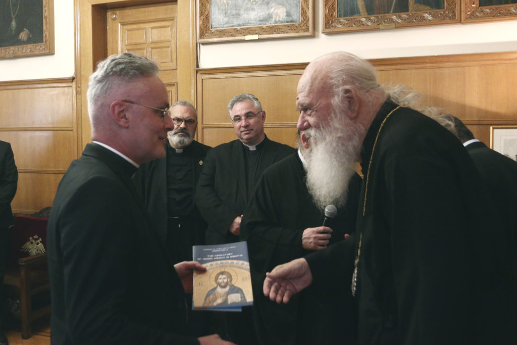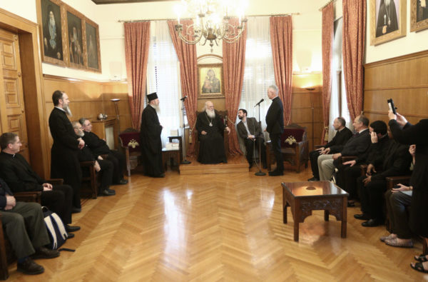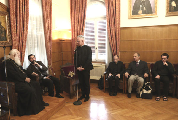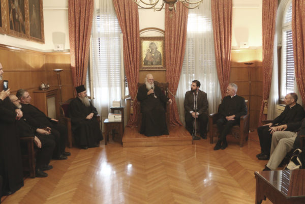 Ο Κοσμήτορας ευχαρίστησε τον Αρχιεπίσκοπο για την υποδοχή και μίλησε για την σημασία του διαλόγου και την Συνοδικότητα. Ο Αρχιεπίσκοπος τους καλωσόρισε και αναφέρθηκε σε ουσιαστικά ζητήματα που τους απασχολούν. Μίλησε για τις ιερατικές συνάξεις που πραγματοποίησε πρόσφατα η Ιερά Αρχιεπισκοπή Αθηνών και στο θέμα που αναπτύχθηκε αναφορικά με τις σχέσεις των κληρικών με τον Επίσκοπό τους. Τόνισε, επίσης, ότι όποια θέματα προκύπτουν αντιμετωπίζονται όλα συνοδικά.