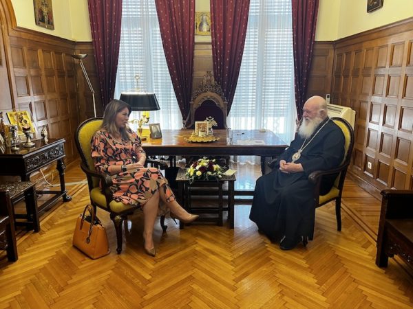 Αρχικά ο Μακαριώτατος υποδέχθηκε την Υφυπουργό Τουρισμού Έλενα Ράπτη και συζήτησαν διάφορα θέματα σχετικά με τον προσκυνηματικό τουρισμό.