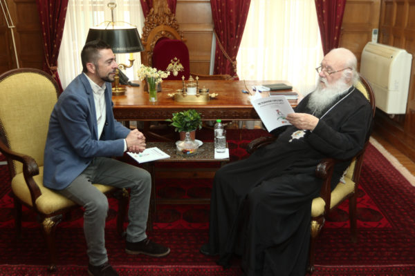 Κατόπιν, τον Αρχιεπίσκοπο επισκέφθηκε ο Δημοσιογράφος – Συγγραφέας κ. Μάνος Χαραλαμπάκης, ο οποίος ευχαρίστησε τον Μακαριώτατο για την υποδοχή και του προσέφερε το βιβλίο του με τον τίτλο: «Με ποδηλατάκι γοργό γοργό». Ένα βιβλίο με κεντρικό θέμα την κλιματική αλλαγή και την προστασία του περιβάλλοντος.
