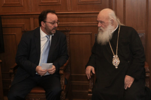 Ο Διευθύνων Σύμβουλος της STAR A.E. Ραδιοτηλεοπτικός Οργανισμός Κεντρικής Ελλάδας κ. Γιώργος Σιμόπουλος επισκέφθηκε σήμερα το πρωί τον Αρχιεπίσκοπο Αθηνών και πάσης Ελλάδος κ.κ. Ιερώνυμο στο Συνοδικό Μέγαρο κατά την διάρκεια του διαλείμματος των εργασιών της ΔΙΣ.