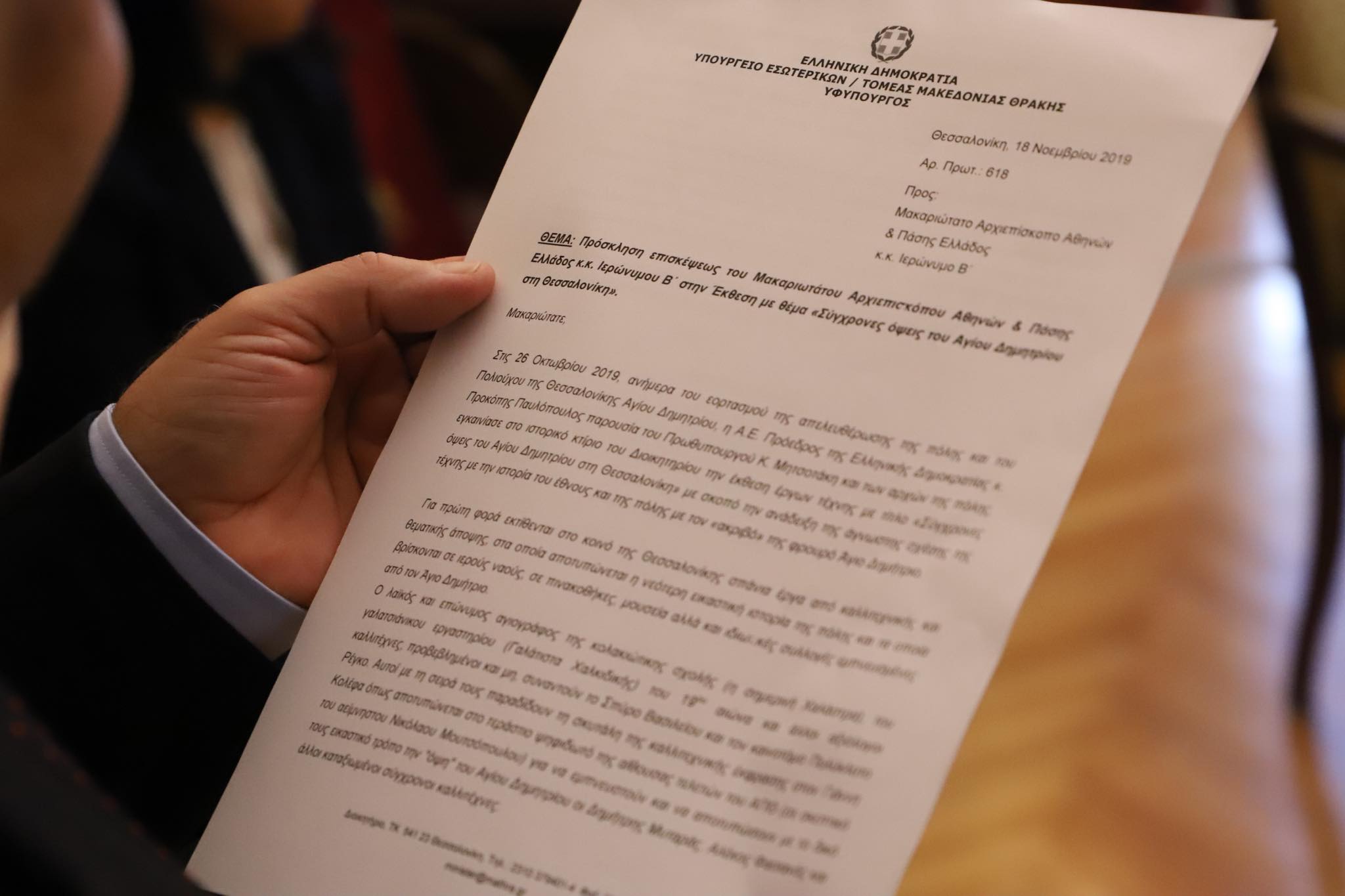 Να επισκεφθεί την έκθεση έργων τέχνης με τίτλο «Σύγχρονες “όψεις” του Αγίου Δημητρίου στη Θεσσαλονίκη» κάλεσε τον Αρχιεπίσκοπο Αθηνών και πάσης Ελλάδος κ. Ιερώνυμο ο Υφυπουργός Εσωτερικών (Μακεδονίας και Θράκης) κ. Θεόδωρος Καράογλου.