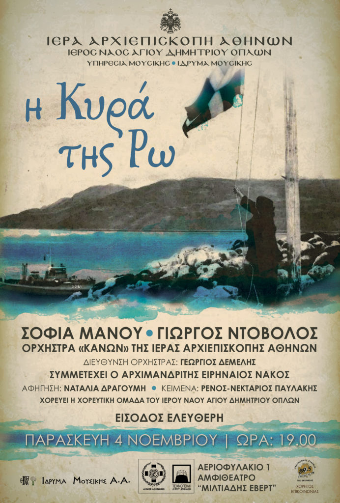 Η Υπηρεσία Διοργάνωσης μουσικών εκδηλώσεων, Βυζαντινής και Ευρωπαϊκής Μουσικής και Ηχογραφήσεων και το Εκκλησιαστικό Ίδρυμα Βυζαντινής και Παραδοσιακής Μουσικής της Ιεράς Αρχιεπισκοπής Αθηνών, σε συνεργασία με τον Ιερό Ναό Αγίου Δημητρίου των Όπλων, διοργανώνουν την θεματική συναυλία «Η Κυρά της Ρω».