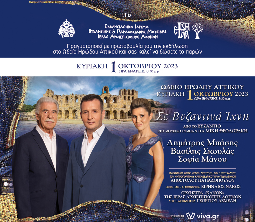 Συναυλία με θέμα: “Σε βυζαντινά ίχνη” δύο χιλιετίες Βυζαντινής Μουσικής, από το Βυζάντιο στο μουσικό σύμπαν του Μίκη Θεοδωράκη, θα πραγματοποιηθεί την Κυριακή 1 Οκτωβρίου 2023 στο Ωδείο Ηρώδου Αττικού με πρωτοβουλία του Ιδρύματος Μουσικής της Αρχιεπισκοπής Αθηνών.