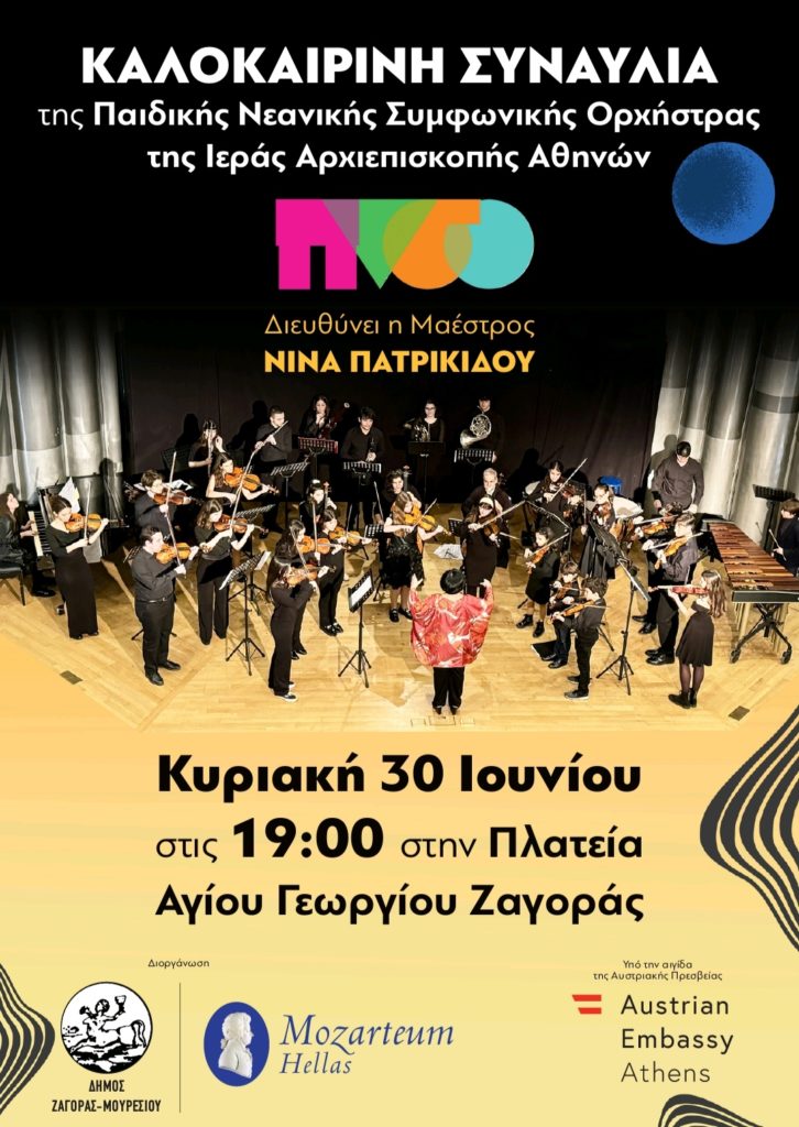 Ο Δήμος Ζαγοράς Μουρεσίου σε συνεργασία με το Ίδρυμα Mozarteum Hellas, υπό την αιγίδα της Αυστριακής Πρεσβείας, διοργανώνει μουσική εκδήλωση – καλοκαιρινή συναυλία, φιλοξενώντας την Παιδική Νεανική Συμφωνική Ορχήστρα της Ιεράς Αρχιεπισκοπής Αθηνών, υπό τη διεύθυνση της φημισμένης μαέστρου Νίνας Πατρικίδου την Κυριακή 30 Ιουνίου 2024 και ώρα 19:00 στην κεντρική πλατεία του Αγίου Γεωργίου Ζαγοράς.