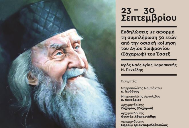 Ξεκίνησαν χθες Σάββατο 23 Σεπτεμβρίου 2023, στον κατάμεστο Ιερό Ναό Αγίας Παρασκευής Ν. Πεντέλης οι εκδηλώσεις που διοργανώνουν ο Ναός, η Ιερά Αρχιεπισκοπή Αθηνώ και το Ίδρυμα Νεότητας και Οικογένειας με αφορμή τη συμπλήρωση 30 ετών από την οσιακή κοίμηση του Αγίου Σωφρονίου (Σάχαρωφ) του Έσσεξ.