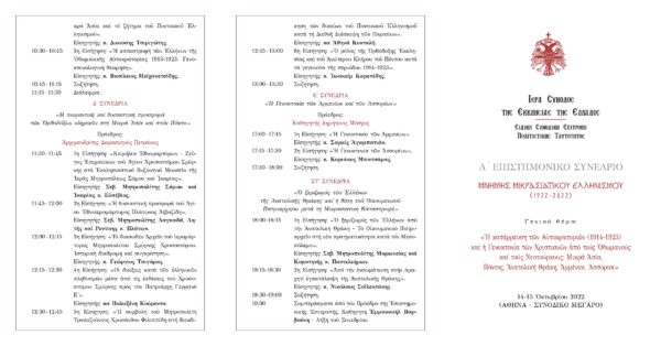 Υπενθυμίζεται ότι η Ιερά Σύνοδος της Εκκλησίας της Ελλάδος, διά της Ειδικής Συνοδικής Επιτροπής Πολιτιστικής Ταυτότητος, διοργανώνει την Παρασκευή 14 και το Σάββατο 15 Οκτωβρίου το Α΄ Επιστημονικό Συνέδριο για την επέτειο των 100 ετών από τη Μικρασιατική Καταστροφή.