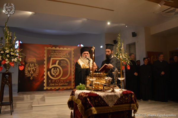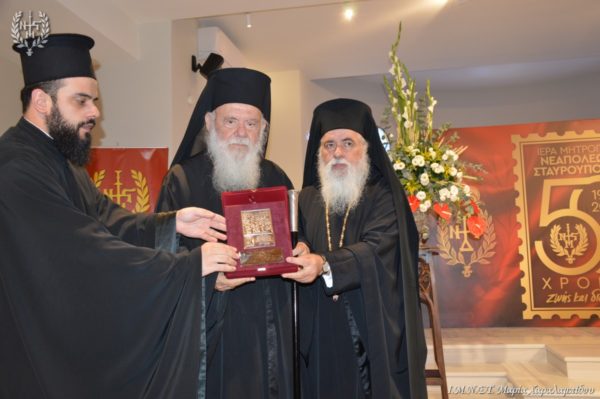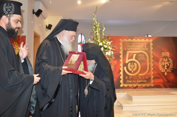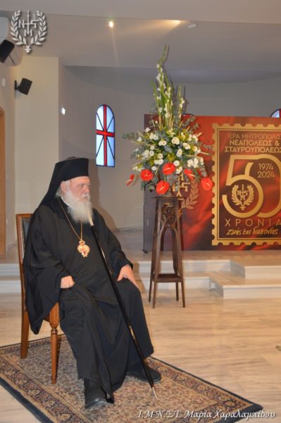 «Η Ιερά Σύνοδος επικοινωνεί μαζί σας δια της ταπεινότητός μου με την ευκαιρία της επετείου των 50 χρόνων. Το Χρυσό ιωβηλαίο. Αποκτά ο άνθρωπος εκκλησιαστική συνείδηση και πνευματική αίσθηση ότι μετέχει από το παρόν στην άνω Ιερουσαλήμ. Η Εκκλησία ενώνει τους ανθρώπους με τον Θεό. Τους στολίζει με τους καρπούς του Αγίου Πνεύματος. Η Μητρόπολη Νεαπόλεως και Σταυρουπόλεως ιδρύθηκε το 1973 με εισήγηση του μακαριστού Αρχιεπισκόπου κ. Σεραφείμ. Πρώτος Μητροπολίτης ήταν ο κυρός Διονύσιος. Το πρώτο ποίμνιο το συνέστησαν οι πρόσφυγες το 1922 που διωγμένοι από τις αλησμόνητες πατρίδες κατέφθασαν ρακένδυτοι στη Δυτική Θεσσαλονίκη. Συνέχισαν να ζουν με ευλάβεια, εργατικότητα και αξιοπρέπεια. Εδώ θεμελίωσαν Ναούς, για να στεγάσουν τα Ιερά κειμήλια, τις εικόνες , τα Άγια λείψανα. Επάξια συνεχίζει τη διαποίμανση ο Σεβασμιώτατος κ.Βαρνάβας ο οποίος εργάζεται με αμείωτο ενθουσιασμό, με ζήλο, με αυταπάρνηση και πνεύμα θυσίας. Εκδαπανά τον εαυτό του υπέρ του λαού του Θεού. Φωτίζει και αγιάζει το πλήρωμα της Ιεράς Μητροπόλεως Νεαπόλεως και Σταυρουπόλεως».