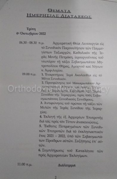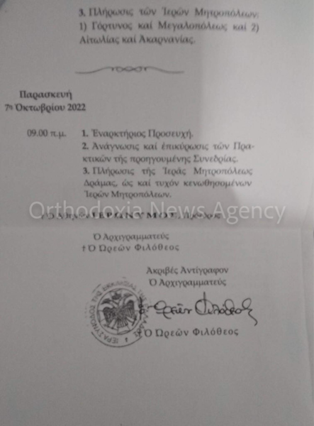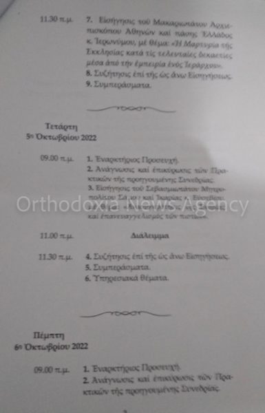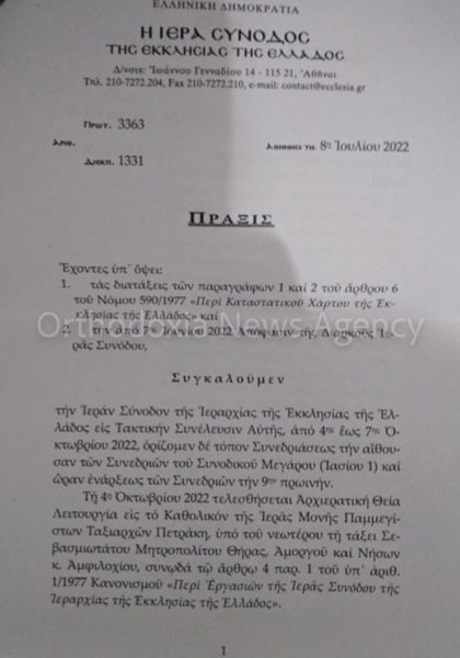 Σύμφωνα με την ανακοίνωση, συγκαλείται Ιερά Σύνοδος της Ιεραρχίας της Εκκλησίας της Ελλάδος στην Τακτική Συνέλευση αυτής από τις 4 έως τις 7 Οκτωβρίου 2022. Τόπος Συνεδρίασης θα είναι η αίθουσα των Συνεδριών του Συνοδικού Μεγάρου και ώρα έναρξης ορίζεται η 9πμ.
