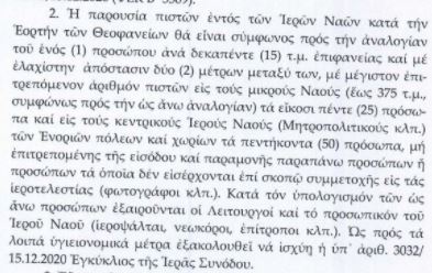 Ειδικότερα, στην εγκύκλιο υπενθυμίζεται ότι με βάση την προηγούμενη Κοινή Υπουργική Απόφαση η παρουσία πιστών εντός των εκκλησιών και την εορτή των Θεοφανείων θα είναι με αναλογία ένας ανά 15 τμ, με ελάχιστη απόσταση 2 μέτρων και μέγιστο αριθμό πιστών εντός των ναών (έως 375 τμ) τους 25.