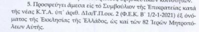 Επίσης, στην ίδια εγκύκλιο γνωστοποιείται η προσφυγή άμεσα, στο Συμβούλιο της Επικρατείας κατά της νέας ΚΥΑ υπ’ αριθ. Δ1α/Γ.Π.οικ.2 (ΦΕΚ Β’ 1/2-1-2021) εξ ονόματος της Εκκλησίας της Ελλάδος “ως και των 82 Ιερών Μητροπόλεων αυτής”