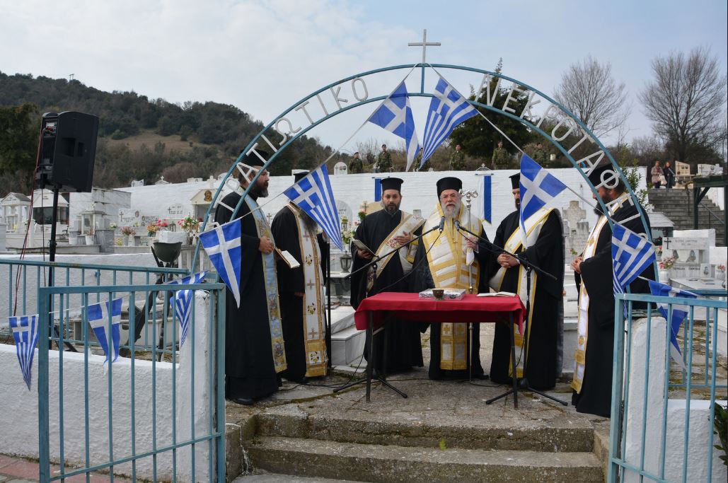 Το τρισάγιο τέλεσε, στο Στρατιωτικό Κοιμητήριο της πόλεώς που βρίσκεται εντός του Α’ Νεκροταφείου, ο οικείος Μητροπολίτης κ. Άνθιμος παρόντων των στρατιωτικών και πολιτικών αρχών του τόπου. Στη σύντομη προσφώνησή του ο Μητροπολίτης ευχαρίστησε το Διοικητή της 12ης Μεραρχίας υποστράτηγο κ. Κούκκο για την προετοιμασία και επιμέλεια του τρισαγίου που μας δίνει την ευκαιρία να τελέσουμε το επίσημο μνημόσυνο των ανθρώπων που αγωνίστηκαν για την πατρίδα μας. “Κρατάμε την παράδοση για τους κεκοιμημένους γιατί η Εκκλησία τιμά τον άνθρωπο! Η αξία του ανθρώπου έχει σημασία… Τιμάμε τον άνθρωπο πριν γεννηθεί, όταν γεννηθεί και αφού φύγει από αυτή τη ζωή!“, τόνισε χαρακτηριστικά ο Σεβασμιώτατος.