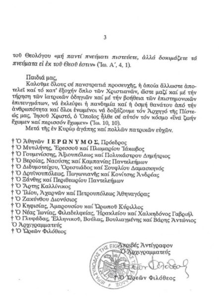“Η Εκκλησία εμπιστεύεται την επιστημονική κοινότητα των ιατρών, η οποία νυχθημερόν αγωνίζεται για την απαλλαγή των ανθρώπων απο την θανατηφόρο πανδημία. Με τον φωτισμό του Θεού και την επίμονη προσπάθεια των επιστημόνων ιατρών, η ανθρωπότητα έχει πλέον στη διάθεση της το εμβόλιο, το οποίο είνα ικανό να υψώσει το τείχος στην εξάπλωση της πανδημίας” αναφέρεται, μεταξύ άλλων.