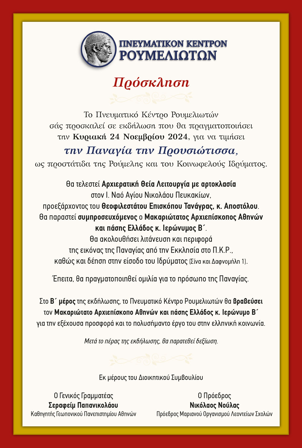 Το Πνευματικό Κέντρο Ρουμελιωτών προσκαλεί σε εκδήλωση που θα πραγματοποιήσει την Κυριακή 24 Νοεμβρίου για να τιμήσει την Παναγία την Προυσιώτισσα, ως προστάτιδα της Ρούμελης και του Κοινωφελούς Ιδρύματος.