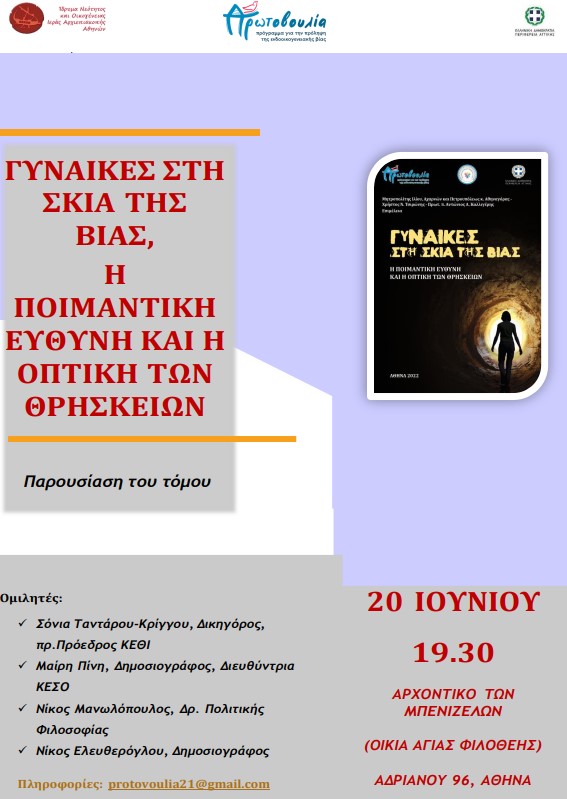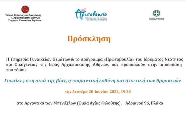 Η Υπηρεσία Γυναικείων Θεμάτων και το πρόγραμμα «Πρωτοβουλία» του Ιδρύματος Νεότητος και Οικογένειας της Ιεράς Αρχιεπισκοπής Αθηνών, προσκαλούν στην παρουσία του τόμου «Γυναίκες στη σκιά της βίας, η ποιμαντική ευθύνη και η οπτική των θρησκειών», τη Δευτέρα 20 Ιουνίου στις 19:30, στο Αρχοντικό των Μπενιζέλων (Οικία Αγίας Φιλοθέης).