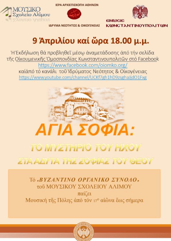Το Ίδρυμα Νεότητος & Οικογένειας της Ιεράς Αρχιεπισκοπής Αθηνών σε συνεργασία με την Ένωση Κωνσταντινουπολιτών και το Μουσικό Σχολείο Αλίμου παρουσιάζει το Πολιτιστικό Πρόγραμμα του Βυζαντινού Οργανικού Συνόλου του σχολείου