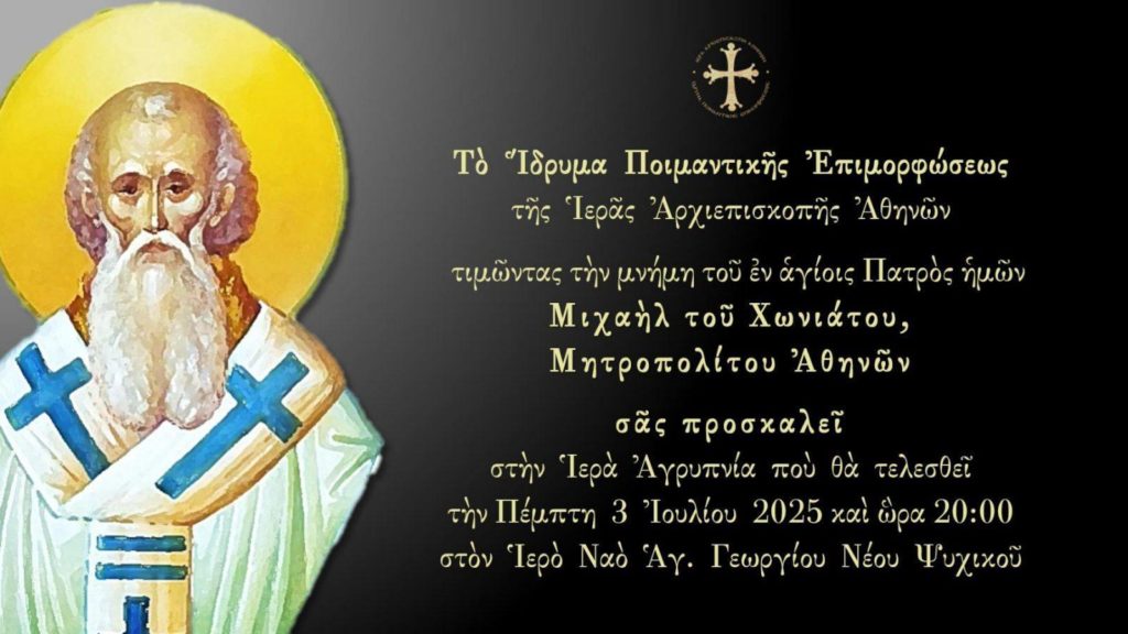 Τη μνήμη του Αγίου Μιχαήλ του Χωνιάτη (Μητροπολίτη Αθηνών) θα τιμήσει και φέτος το Ίδρυμα Ποιμαντικής Επιμόρφωσης της Ιεράς Αρχιεπισκοπής Αθηνών.
