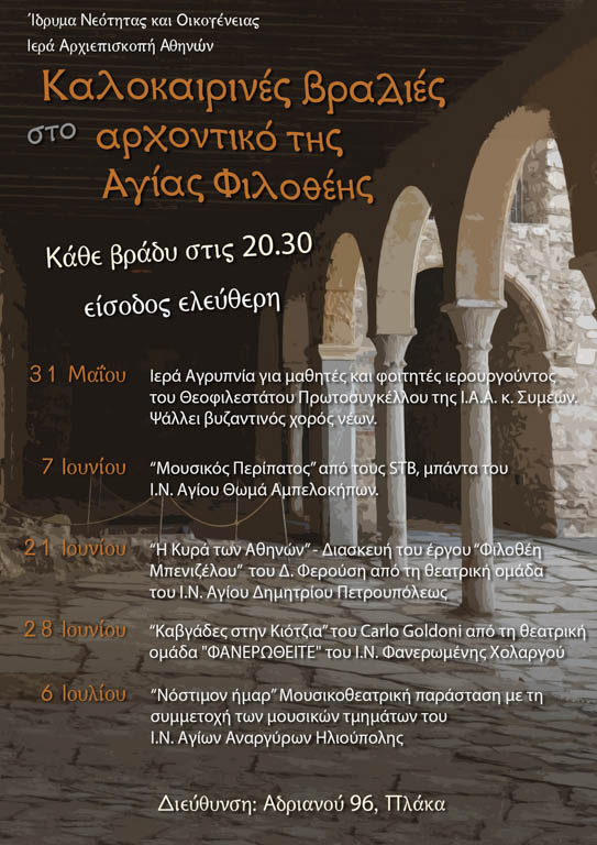 Εκδηλώσεις πολιτισμού από νέους των ενοριών της Ι. Αρχιεπισκοπής πραγματοποιούνται στη διάρκεια του καλοκαιριού στο Αρχοντικό της Αγίας Φιλοθέης (Αδριανού 96, Πλάκα), με συντονισμό από το Ίδρυμα Νεότητος και Οικογένειας της Ιεράς Αρχιεπισκοπής Αθηνών.