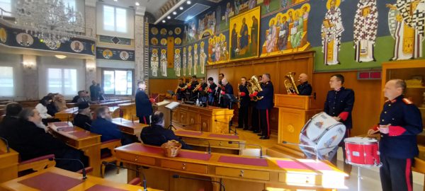 Σήμερα, Παρασκευή 19 Δεκεμβρίου, παρόντος του Θεοφιλεστάτου Αρχιγραμματέως της Ιεράς Συνόδου, έψαλε τα κάλαντα η Μουσική Μπάντα του Πυροσβεστικού Σώματος, υπό την διεύθυνση του Αρχιμουσικού–Υποπυραγού κ. Δημήτριου Κουνδουράκη.
