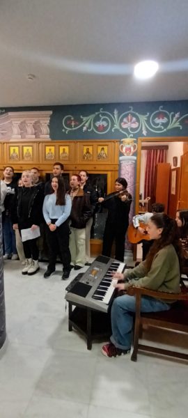 Οι μαθητές, συνοδευόμενοι από τις καθηγήτριες κ.κ. Μαρία Παπακώστα και Φωτεινή Μπούρδαλα, και η παιδική μαντολινάτα και η χορωδία, υπό τη διεύθυνση του Αρχιμουσικού κ. Ιωάννου Θεοδωρόπουλου και συνοδευόμενες από τον Προϊστάμενο του Ναού, Πρωτοπρ. π. Σπυρίδωνα Λόντο, έψαλαν κάλαντα, παρόντος του Αρχιγραμματέως της Ιεράς Συνόδου, Πανοσιολ. Αρχιμανδρίτου κ. Ιωάννου Καραμούζη, της Διευθύντριας του ΚΕ.Σ.Ο. κ. Μαίρης Πίνη, καθώς και Κληρικών και λαϊκών Συνοδικών Υπαλλήλων.