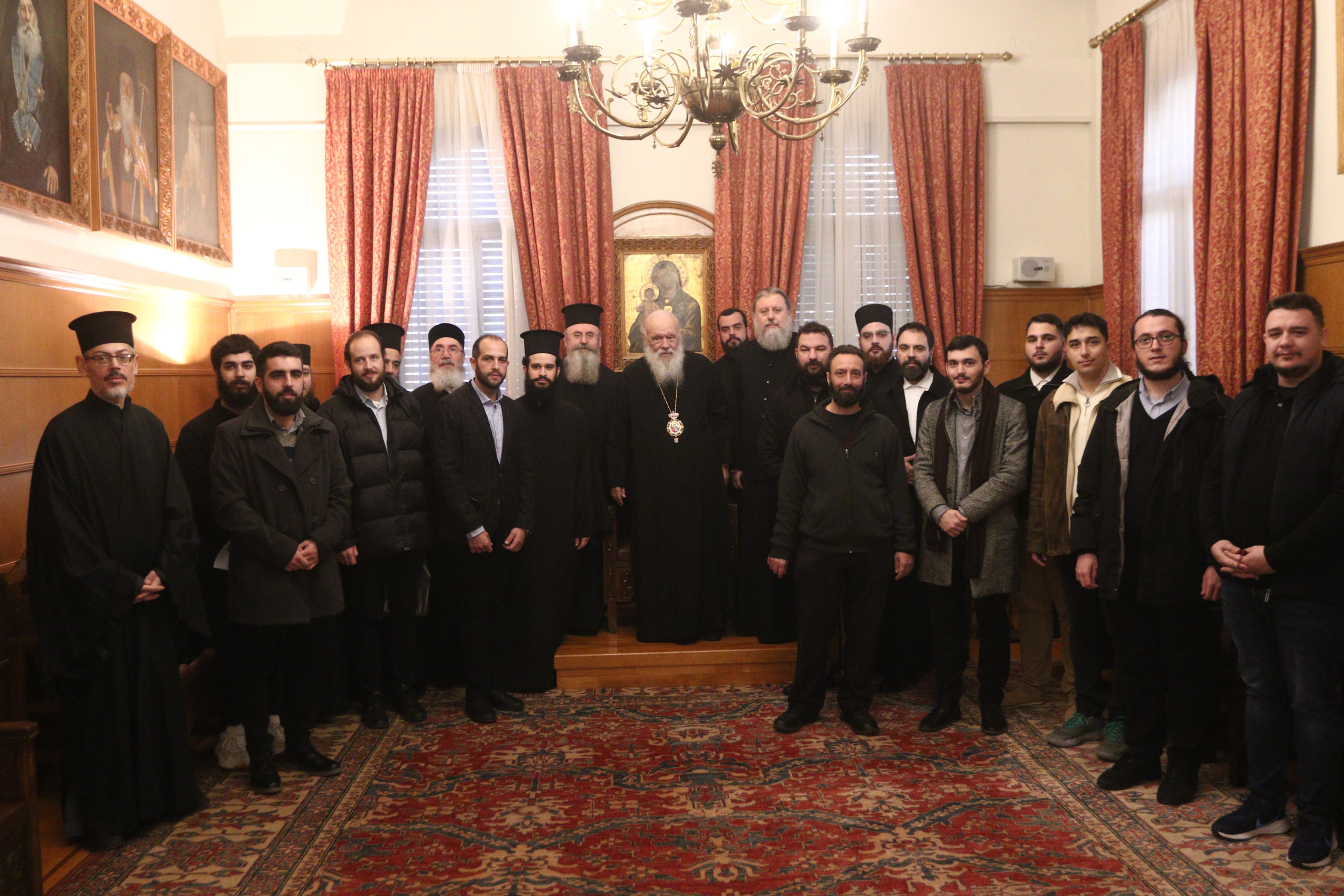 Αμέσως μετά, τα κάλαντα έψαλαν σπουδαστές από τη Σχολή Μαθητείας Υποψηφίων Κληρικών (Σ.Μ.Υ.Κ.). Τους σπουδαστές συνόδευαν ο Καθηγητής Μητροπολίτης Περιστερίου κ. Γρηγόριος, ο Επίσκοπος Ταλαντίου κ. Θεολόγος, Γενικός Διευθυντής του Ι.Π.Ε. της Ι.Α.Α., ο οποίος μετέφερε στον Αρχιεπίσκοπο ευχές εκ μέρους του ΕΣΕΕ, καθώς και ο Διευθυντής της ΣΜΥΚ – Ριζαρείου, Αρχιμανδρίτης Πολύκαρπος Κάστιζας, μαζί με καθηγητές της Σχολής.