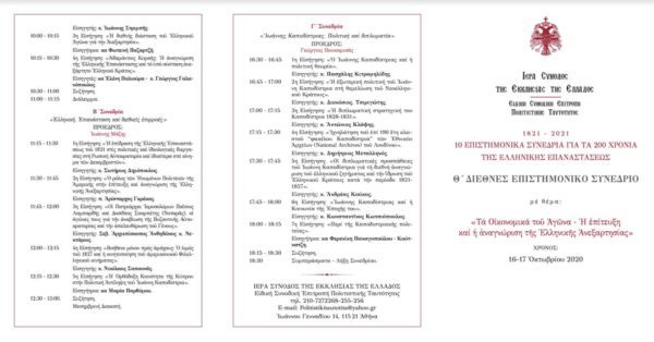 Συνεχίζονται σήμερα οι εργασίες του Θ’ Διεθνούς Επιστημονικού Συνεδρίου με θέμα «Τα Οικονομικά του Αγώνος – Η επίτευξη και η αναγνώριση της Ελληνικής Ανεξαρτησίας», το οποίο διοργανώνει η Ιερά Σύνοδος της Εκκλησίας της Ελλάδος. Φέτος, εξαιτίας των ειδικών συνθηκών που επικρατούν λόγω της πανδημίας το συνέδριο πραγματοποιείται διαδυκτιακά.