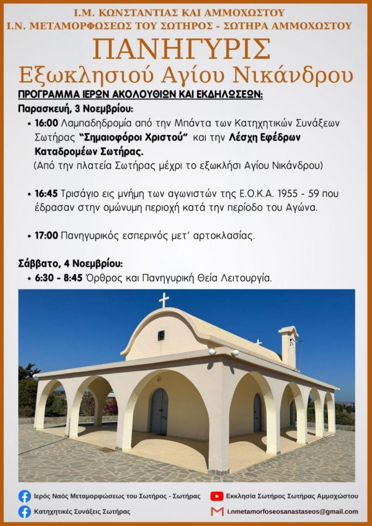 Στις 4 Νοεμβρίου, εορτάζει η Εκκλησία τη μνήμη του Αγίου Νικάνδρου, ενός εκ των μαθητών του Αποστόλου Τίτου. Την ημέρα αυτή πανηγυρίζει το ομώνυμο εξωκλήσι που βρίσκεται στα όρια της περιφέρειας της Ιεράς Μητρόπολης Κωνσταντίας και Αμμοχώστου, και υπάγεται διοικητικά και λειτουργικά στην ενορία Σωτήρας Αμμοχώστου.