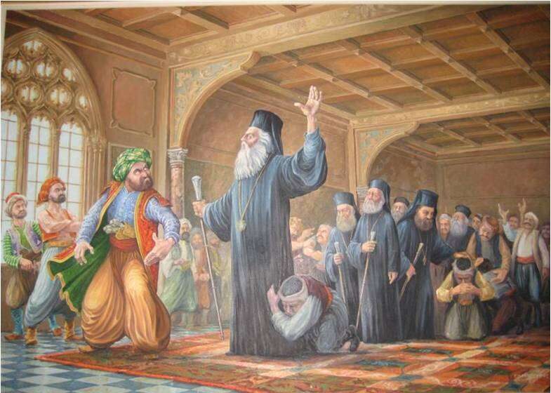 Δεν είναι περιττό, όσες φορές και αν επαναλαμβάνεται, να λεχθεί και τώρα ότι η Εκκλησία, συνδεδεμένη οργανικά με το Έθνος, έγινε όχι μόνο ο φορέας της πίστεως, αλλά και η σωτήριος κιβωτός του Γένους μας και συνεισέφερε είτε σε καιρούς ειρήνης και ελευθερίας στη θρησκευτική και εθνική παιδεία, είτε σε καιρούς χαλεπούς θυσίες για την ελευθερία και την τιμή του Έθνους. Υπενθυμίζουμε ότι οι πρώτοι, οι οποίοι δέχθηκαν τη μανία των δυναστών με την έναρξη του ελληνικού απελευθερωτικού αγώνα ήσαν ο Οικουμενικός Πατριάρχης Γρηγόριος ο Ε’, οι Μητροπολίτες Εφέσου, Νικομηδείας και Αγχιάλου, ο Μητροπολίτης Αδριανουπόλεως και 12 ανώτεροι κληρικοί της περιοχής, ο Αρχιεπίσκοπος Κρήτης και 6 επίσκοποι της Νήσου, όπως και η σεπτή ιεραρχία της Κυπριακής Εκκλησίας με όλους τούς ανώτερους κληρικούς και προύχοντες του τόπου. Το αίμα της θυσίας τους πότισε και αύξησε το δένδρο της ελευθερίας του Γένους από το βαρύ ζυγό της δουλείας. Όμως, η ευγνωμοσύνη και το χρέος μας προς αυτούς είναι ευρύτερο και βαθύτερο. Έχει λεχθεί ότι ένα Έθνος εξαφανίζεται εφ’ ενός μεν ένεκα της ελλείψεως ηγετών, αφ’ ετέρου δε ένεκα της αποξενώσεως του λαού από τα ιερά και τα όσια της φυλής του. Όμως, η ευλογία και η πρόνοια του Θεού ευδόκησε ώστε, κατά τούς χαλεπούς εκείνους χρόνους της δουλείας, το Έθνος μας να μη στερηθεί από ηγέτες αντάξιους των δύσκολων περιστάσεων, τούς εκκλησιαστικούς ηγέτες, οι οποίοι ποδηγέτησαν το Έθνος και το έθρεψαν με τις αθάνατες αξίες της χριστιανικής θρησκείας και του ελληνικού πολιτισμού. Η Ευρώπη πρέπει να αισθάνεται την ίδια ευγνωμοσύνη μαζί μας, γιατί το Ελληνικό Έθνος, όπως και οι υπόλοιποι ορθόδοξοι λαοί, με τις απειράριθμες εκατόμβες τους στάθηκαν τροχοπέδη στην ισλαμική επέκταση στον Ευρωπαϊκό χώρο.