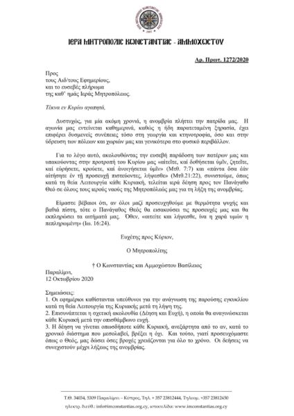 Για το λόγο αυτό ακολουθώντας την ευσεβή παράδοση των πατέρων, ο Μητροπολίτης Κωνσταντίας κ. Βασίλειος συνιστά κάθε Κυρικαή κατά τη θεία Λειτουργία να τελείται δέηση πρός τον Πανάγαθο Θεό σε όλους τους ιερούς ναούς της Μητροπόλεως για τη λήξη της ανομβρίας.