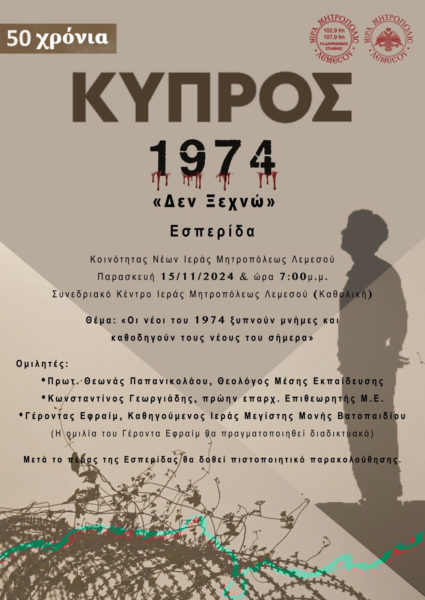 Το Ραδιόφωνο της Ιεράς Μητροπόλεως Λεμεσού σε συνεργασία με την “Πεμπτουσία” και την “Ψηφιακή Ακαδημία Ευγένιος Βούλγαρης” σας προσκαλούν να δηλώσετε συμμετοχή στην Εσπερίδα της Κοινότητας Νέων Ιεράς Μητροπόλεως Λεμεσού: 50 ΧΡΟΝΙΑ ΚΥΠΡΟΣ 1974 «ΔΕΝ ΞΕΧΝΩ», που θα πραγματοποιηθεί την Παρασκευή 15 Νοεμβρίου 2024 στις 19:00.