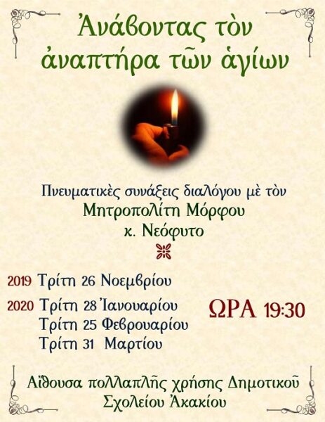 Στὸ πλαίσιο τῶν μηνιαίων πνευματικῶν συνάξεων διαλόγου «Ἀνάβοντας τὸν ἀναπτήρα τῶν ἁγίων» μὲ τὸν Πανιερώτατο Μητροπολίτη Μόρφου κ. Νεόφυτο, θὰ πραγματοποιηθοῦν συνάξεις τὶς παρακάτω ἡμερομηνίες: