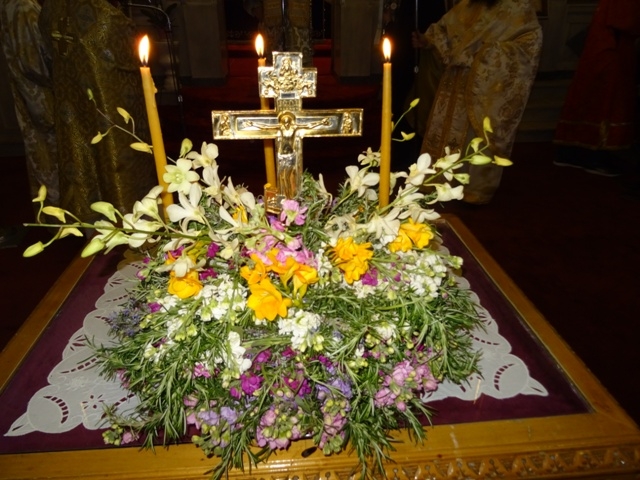 Σταυρὸν Χριστοῦ τὸν τίμιον, σήμερον προτεθέντα, ἰδόντες προσκυνήσωμεν, καὶ πιστῶς εὐφρανθῶμεν, κατασπαζόμενοι πόθῳ, τὸν ἐν τούτῳ θελήσει, σταυρωθέντα αἰτούμενοι, Κύριον ἀξιῶσαι, πάντας ἡμᾶς, τὸν Σταυρὸν τὸν τίμιον προσκυνῆσαι, καὶ φθάσαι τὴν Ἀνάστασιν, πάντας ἀκατακρίτως.