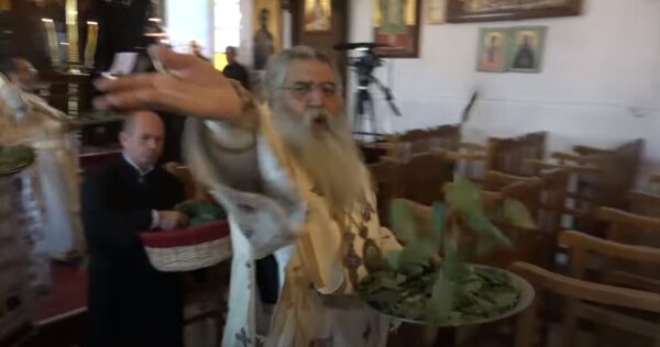 Ο Μητροπολίτης Μόρφου κ. Νεόφυτος βγαίνει με τα βάγια στα χέρια για το “Ανάστα ο Θεός”, κατά το Μεγάλο Σάββατο πρωϊας, 18 Απριλίου 2020