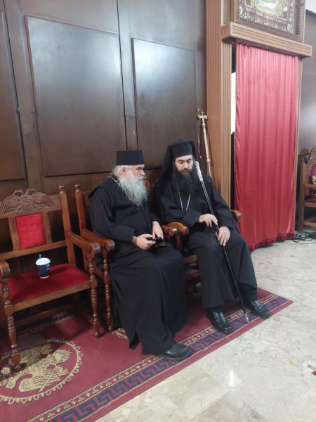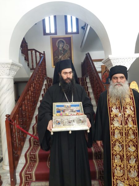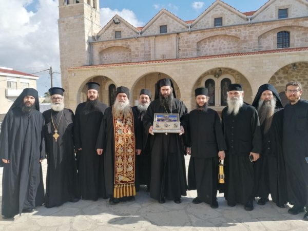 Λίγο πριν την αναχώρηση της Αγίας Ζώνης, ο Πανιερώτατος Μητροπολίτης Πάφου κ. Τυχικός, συνοδευόμενος από Βατοπαιδινούς πατέρες, κόμισε το Θεομητορικό κειμήλιο προς ευλογία στο κτήριο της Ιεράς Μητροπόλεως Πάφου και στην Αστυνομία Πάφου.