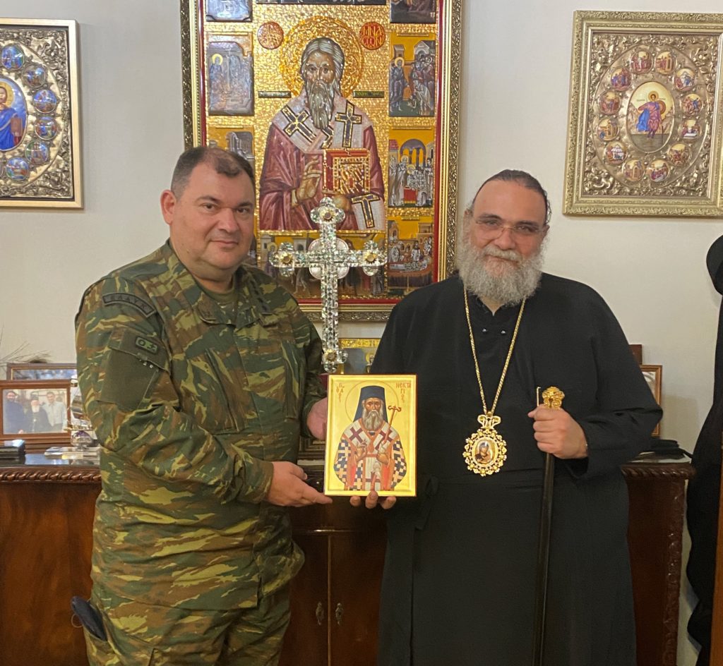 Το νέο Διοικητή της Ελληνικής Δύναμης Κύπρου (ΕΛΔΥΚ), που εδρεύει στην κοινότητα της Μαλούντας, Συνταγματάρχη κ. Παναγιώτη Κεραμιδά, δέχθηκε το πρωί της Πέμπτης, 4 Αυγούστου 2022, στο γραφείο του, ο Πανιερώτατος Μητροπολίτης Ταμασού και Ορεινής κ. Ησαΐας.