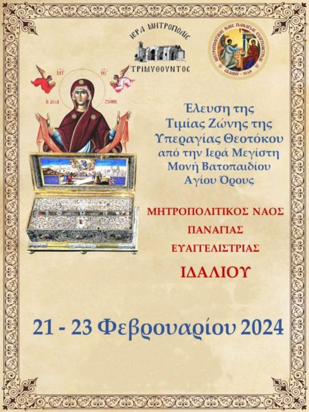 Ο Μητροπολιτικός Ναός Παναγίας Ευαγγελιστρίας Ιδαλίου θα υποδεχτεί την Τιμία Ζώνη της Υπεραγίας Θεοτόκου από την Ιερά Μεγίστη Μονή Βατοπαιδίου του Αγίου Όρους στις 21 Φεβρουαρίου 2024.