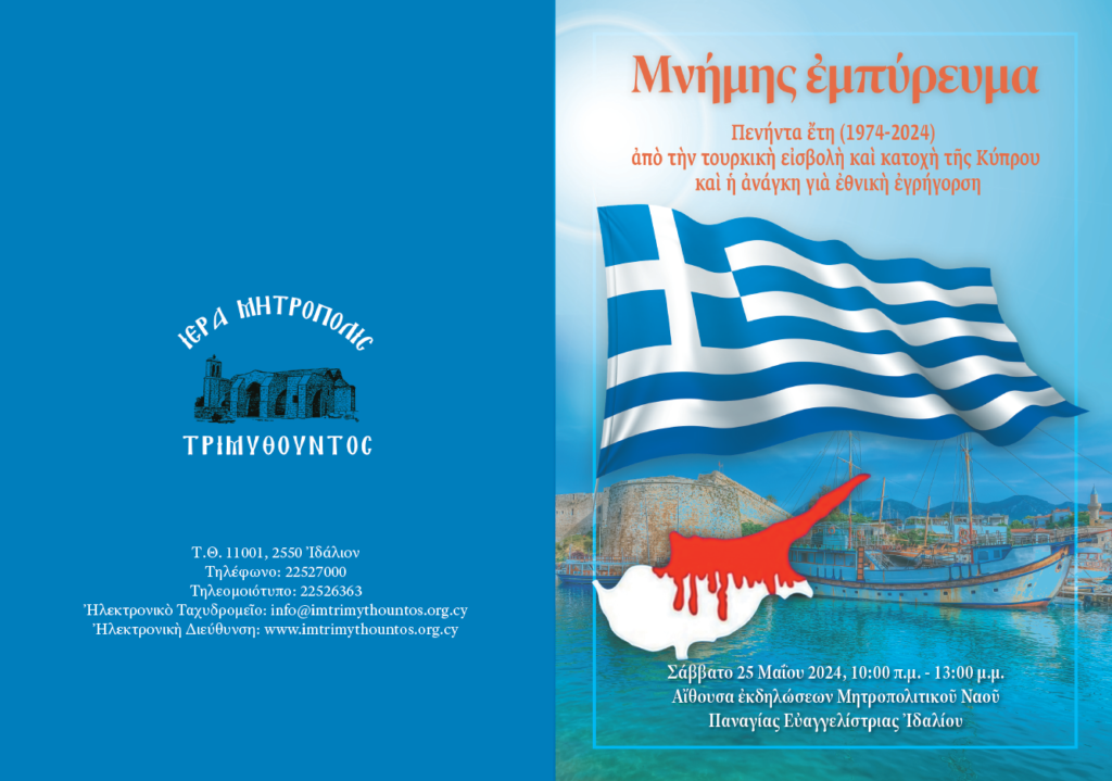 Η Ιερά Μητρόπολη Τριμυθούντος προσκαλεί στην Ημερίδα με τίτλο “Μνήμης εμπύρευμα. Πενήντα έτη (1974-2024) από την τουρκική εισβολή και κατοχή της Κύπρου και η ανάγκη για εθνική εγρήγορση”, που διοργανώνει με αφορμή τη συμπλήρωση 50 χρόνων από την αποφράδα επέτειο της τουρκικής εισβολής και κατοχής του 37% του εδάφους της Κύπρου.