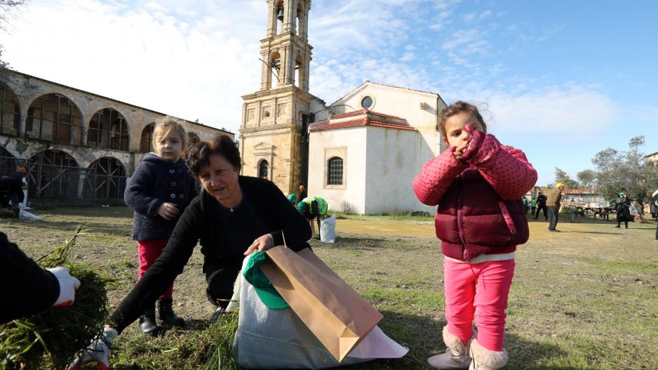 Ελληνοκύπριοι και Τουρκοκύπριοι ένωσαν τις δυνάμεις τους και εργάστηκαν σήμερα για τη συντήρηση και τον καθαρισμό του Μοναστηριού του Αγίου Παντελεήμονα στην κατεχόμενη Μύρτου, η οποίος υπέστη εκτεταμένους βανδαλισμούς.